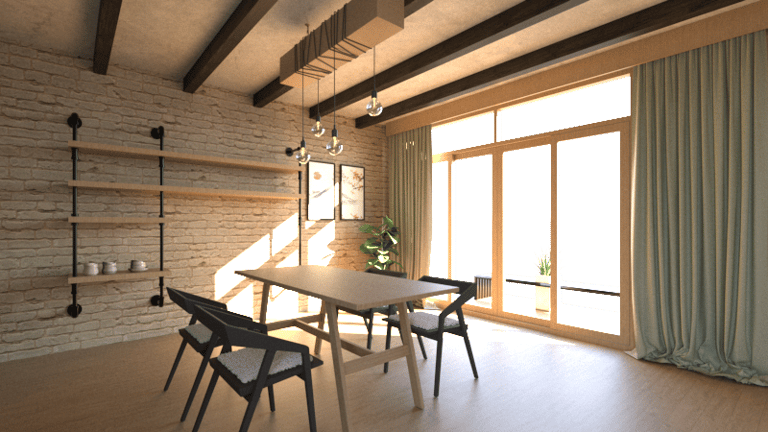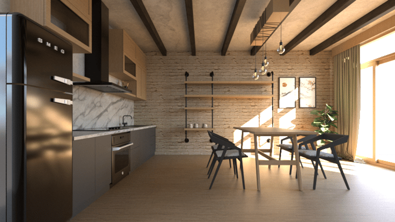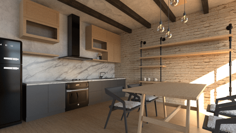 Representación 3D de una cocina abierta con comedor rústico industrial, diseñada con especial atención a los materiales, texturas e iluminación. La combinación de madera, metal y piedra crea un ambiente cálido, mientras que el juego de luces resalta los volúmenes y da profundidad al espacio.