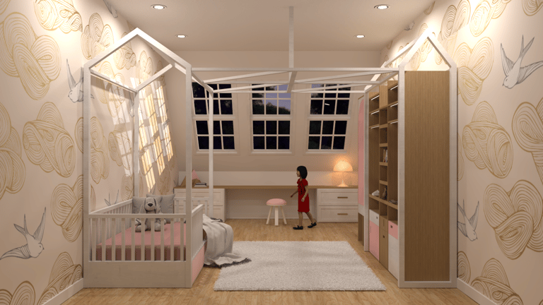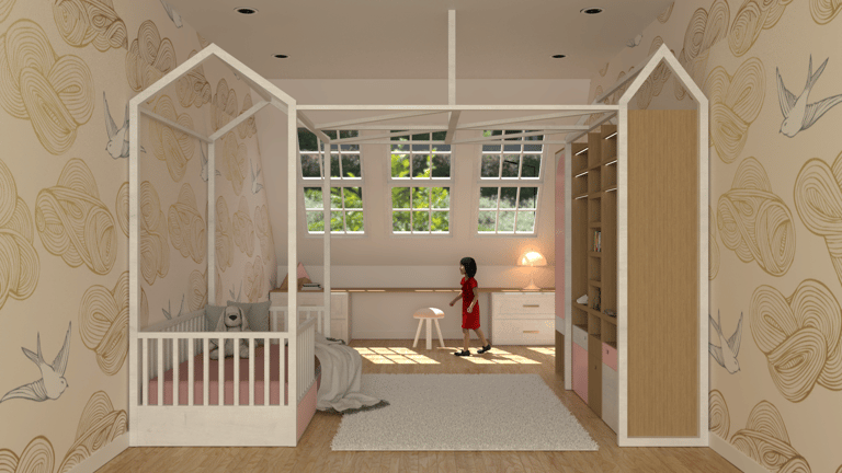 Recreación de la habitación infantil nº 17 de la Casa Cape Cod, diseñada por Raquel García. El render destaca por el trabajo meticuloso en los materiales, la iluminación y la edición, logrando una representación realista y fiel a la esencia original del espacio.